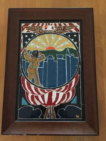 I often use a rotary tool to make figures, faces, and larger elements, then mosaic the backgrounds using various tile shapes (diamonds, teardrops, honeycombs). “Young Lincoln” (sold) is a good example; his face and body were cut into interlocking pieces with a rotary tool, and he is surrounded by teardrops. “Red Dirt Horses” has tiny, fragmented pieces, like the red dust they are kicking up.